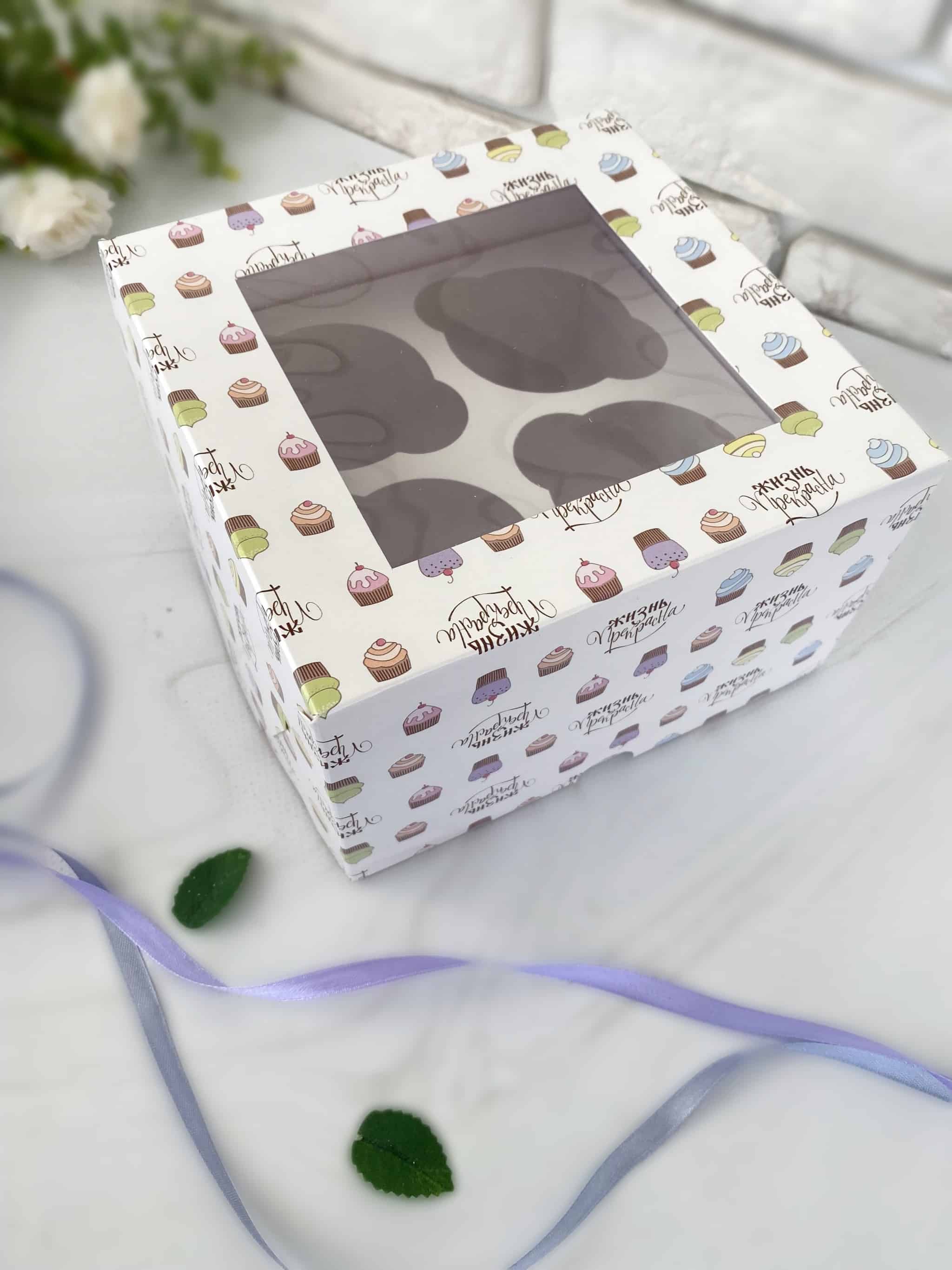 Упаковка под 4 капкейка/пирожных/бенто-торт с окном, белая