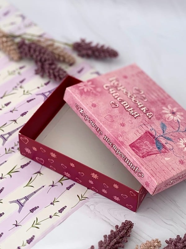 Подарочная упаковка универсального назначения. В качестве отделки используется тиснение розовой фольгой