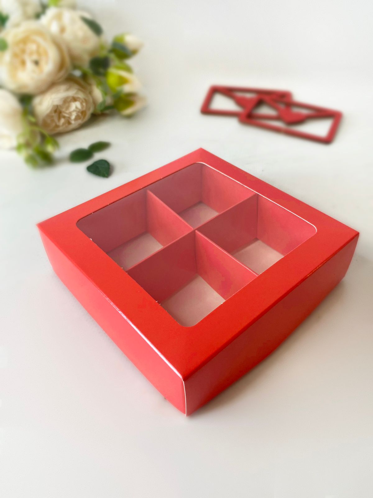 Коробка с окном под 4 макаронс/моти/конфеты Алая, 120х120х35 мм (крышка/дно)
