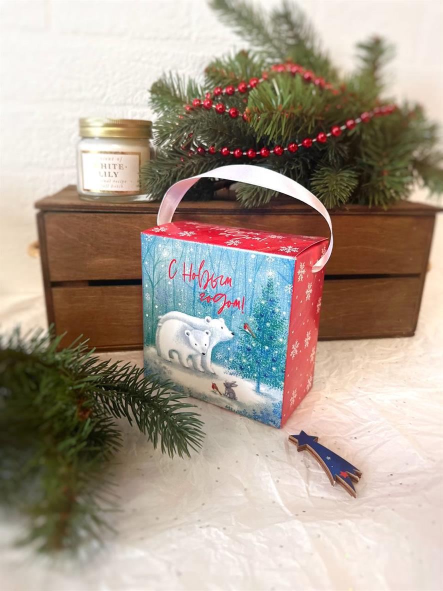 Коробка новогодняя подарочная Мишки на севере, 110х60х110 мм ( моноблок с лентой)